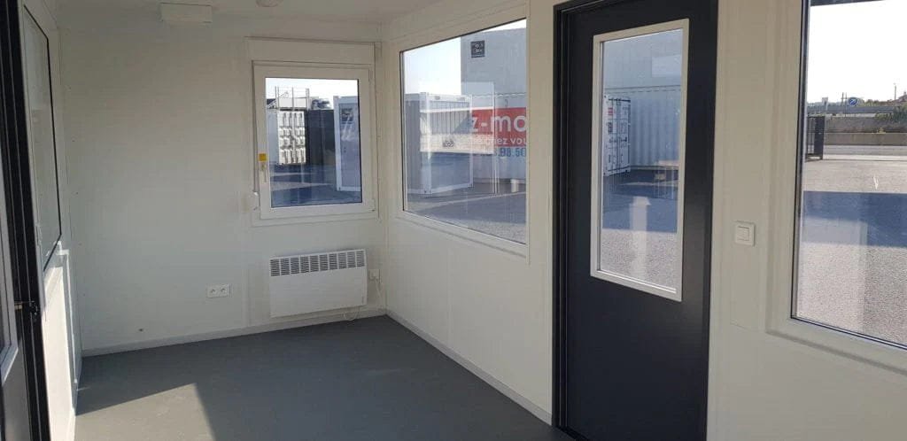 Container ufficio 6x2,43m con struttura in acciaio saldato, isolamento completo e 3 finestre con doppi vetri. Una soluzione robusta, confortevole e a norma per ogni esigenza professionale.