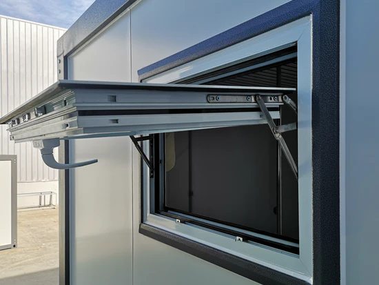 - Extra: Porta con serratura e chiavi, finestra a cerniera, segnaletica uomo/donna, fori di sollevamento, tasche per muletto.