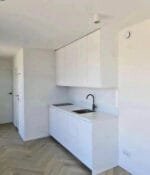 - Cucina attrezzata con piano di lavoro e mobili contenitori.