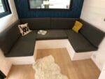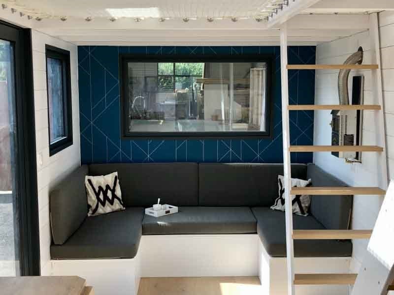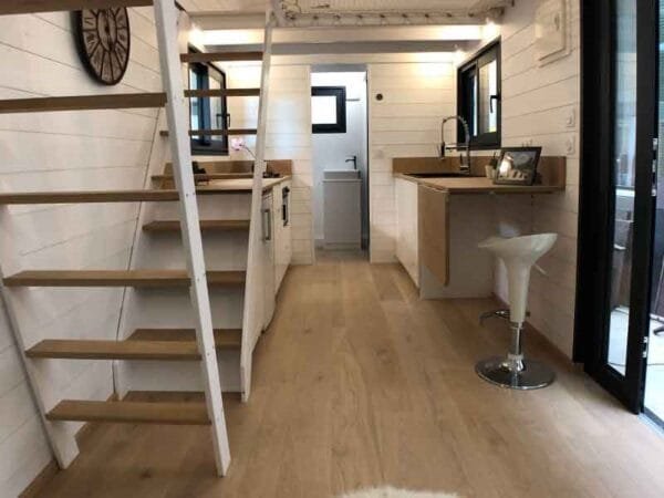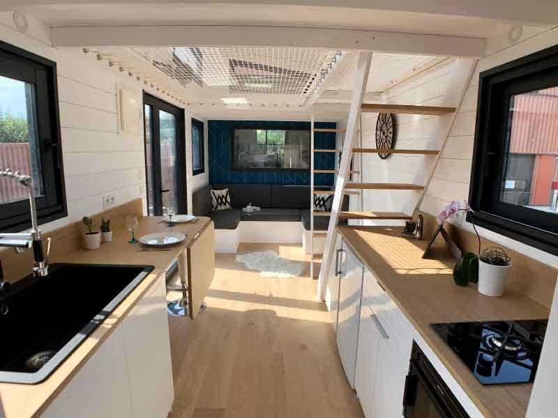 Questa Tiny House è una soluzione abitativa progettata per famiglie numerose o gruppi, offrendo fino a 6 posti letto grazie a due ampi mezzanini, un divano letto su misura e un originale soppalco in rete. Ispirata al modello “La Familiale”, questa Tiny House è completamente autonoma, dotata di pannelli solari per l’elettricità e un sistema di recupero dell’acqua piovana con filtri. Gli interni, rifiniti con materiali di qualità come il rovere massello per il pavimento, offrono un ambiente caldo e accogliente. La cucina attrezzata, il bagno completo e le numerose finestre che garantiscono un’ottima luminosità rendono questa Tiny House una soluzione abitativa confortevole, funzionale e rispettosa dell’ambiente.