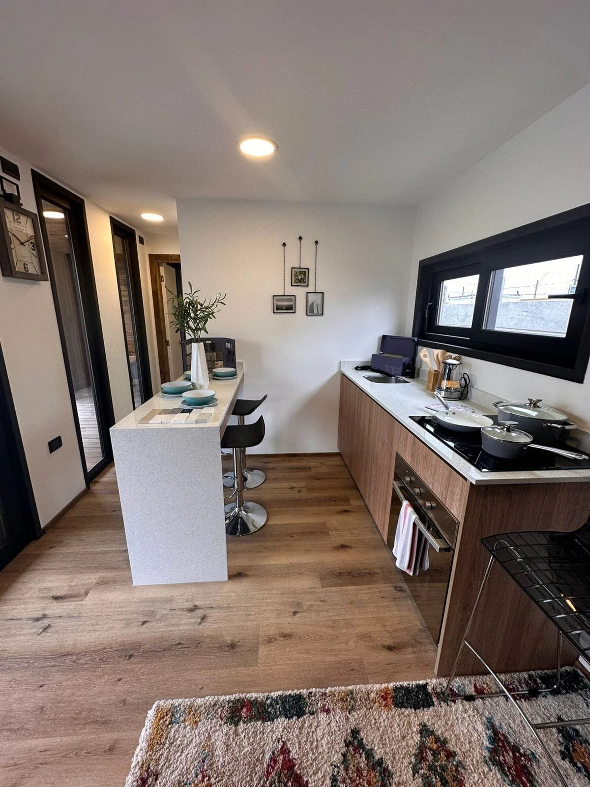 - Design Moderno e Materiali di Qualità: Le finiture come il fibrocemento nero, gli infissi in PVC e il pavimento vinilico creano un look contemporaneo e di pregio.